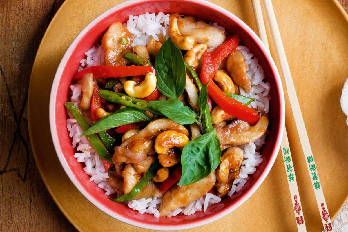 Chicken Cashew Nuts presents an irresistible fusion of spicy and sweet, featuring stir-fried chicken paired with roasted cashew nuts. This renowned Thai delicacy boasts bold flavors from lemongrass, ginger, garlic, red chilies, and onion. Presented atop a bed of rice.