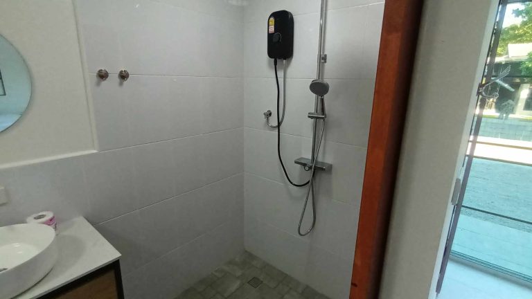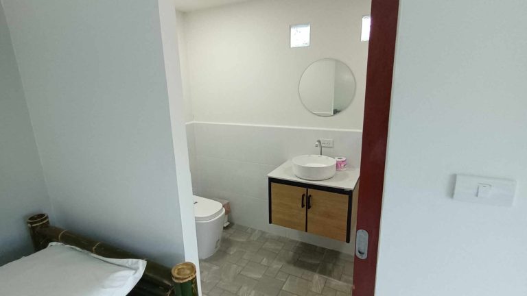 Within the bungalow, you’ll find a private bathroom with modern amenities. Enjoy a refreshing shower under the rainforest-inspired shower head, surrounded by natural stone tiles and bamboo accents. Soft, fluffy towels and toiletries are provided for your comfort and convenience.