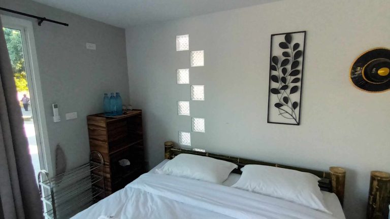 Enjoy one of our bungalows with private bathroom and modern amenities, surrounded by natural stone tiles and bamboo accents.