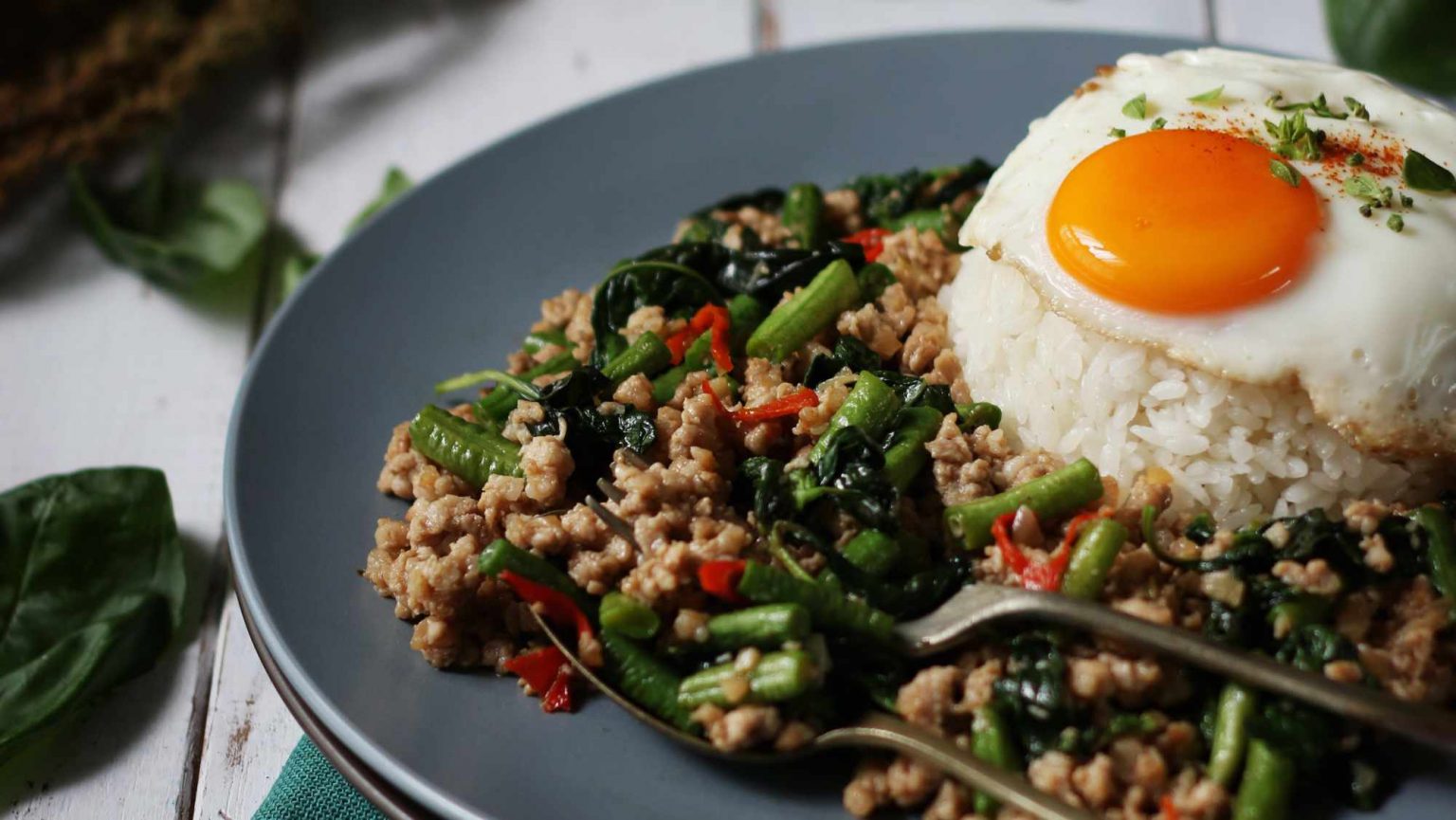 Pad Kaprow isn’t merely a favorite; it’s a culinary icon in Thailand! This dynamic stir-fry showcases a harmonious blend of tastes, featuring succulent diced chicken or pork, aromatic holy basil leaves, and a kick of spice from chilies and garlic.